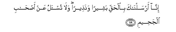 Sesungguhnya Kami telah mengutusmu (Muhammad) dengan kebenaran; sebagai pembawa berita gembira dan pemberi peringatan, dan kamu tidak akan diminta (pertanggungjawaban) tentang penghuni-penghuni neraka.