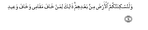 dan Kami pasti akan menempatkan kamu di negeri-negeri itu sesudah mereka. Yang demikian itu (adalah untuk) orang-orang yang takut (akan menghadap) ke hadirat-Ku dan yang takut kepada ancaman-Ku'.