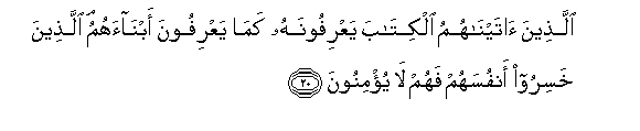 Orang-orang yang telah Kami berikan kitab kepadanya, mereka mengenalnya (Muhammad) seperti mereka mengenal anak-anaknya sendiri. Orang-orang yang merugikan dirinya, mereka itu tidak beriman (kepada Allah).
