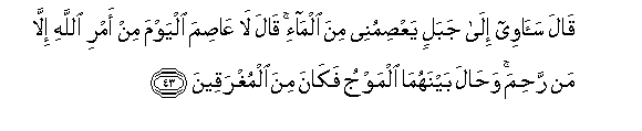Anaknya menjawab: 'Aku akan mencari perlindungan ke gunung yang dapat memeliharaku dari air bah!' Nuh berkata: 'Tidak ada yang melindungi hari ini dari azab Allah selain Allah (saja) Yang Maha Penyayang'. Dan gelombang menjadi penghalang antara keduanya; maka jadilah anak itu termasuk orang-orang yang ditenggelamkan.