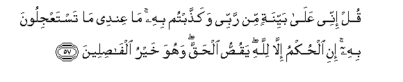 Katakanlah: 'Sesungguhnya aku (berada) di atas hujah yang nyata (Al Qur'an) dari Tuhanku sedang kamu mendustakannya. Bukanlah wewenangku (untuk menurunkan azab) yang kamu tuntut untuk disegerakan kedatangannya. Menetapkan hukum itu hanyalah hak Allah. Dia menerangkan yang sebenarnya dan Dia Pemberi keputusan yang paling baik.