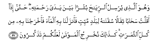 | Dan Dialah yang meniupkan angin sebagai pembawa berita gembira sebelum kedatangan rahmat-Nya (hujan); hingga apabila angin itu telah membawa awan mendung, Kami halau ke suatu daerah yang tandus, lalu Kami turunkan hujan di daerah itu, maka Kami keluarkan dengan sebab hujan itu pelbagai macam buah-buahan. Seperti itulah Kami membangkitkan orang-orang yang telah mati, mudah-mudahan kamu mengambil pelajaran. |